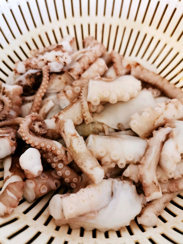 热锅放入植物油,油热后放入姜片和蒜片,出香后放入香菇,洋葱,蒜苗大火翻炒均匀。菜变色后放入八爪鱼迅速翻炒。