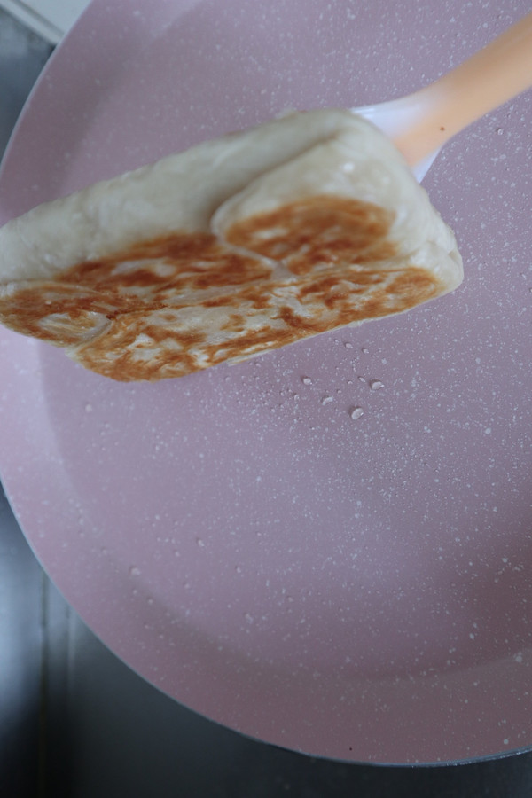 将手抓饼的四个边向里折起,开始开小火煎制~