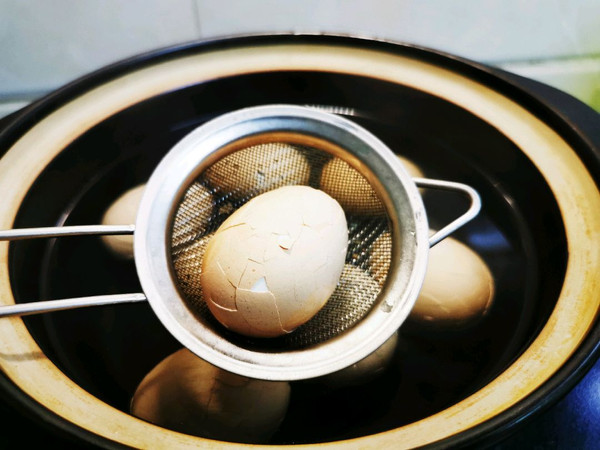 把鸡蛋捞出来,戴上防烫手套,把鸡蛋壳轻轻敲裂,容易入味,再放回砂锅。 将鸡蛋立即放入冷水中,放凉点再敲裂也可以。