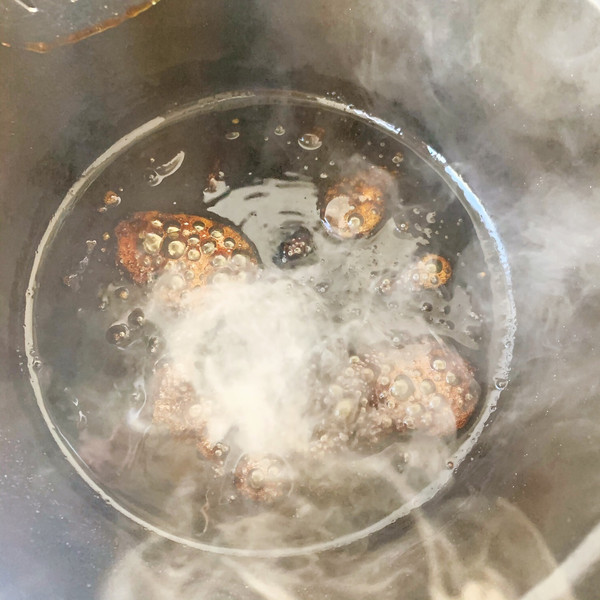 另起鍋,熱鍋涼油,倒入植物油和冰糖炒糖色,待冰糖融化變成焦糖色之後