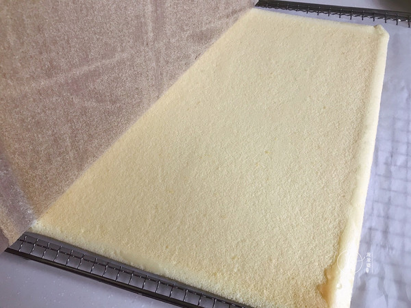 擀面杖放到吸油纸下面将蛋糕卷起来