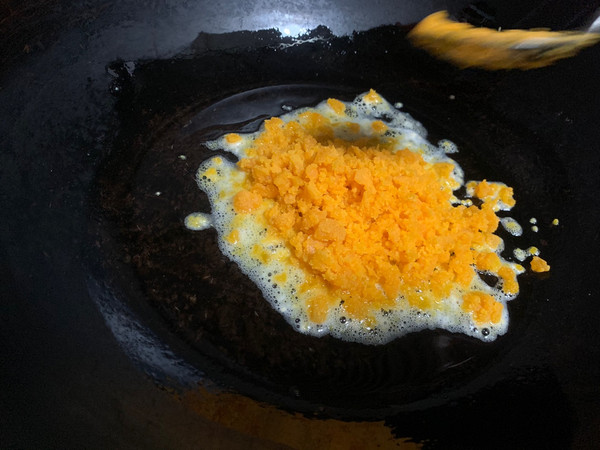 放入压碎的咸蛋黄。小火慢炒。