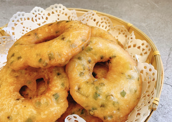 油温170度左右时,将面糊倒入中间有突起的平勺上,平勺要充分预热才不会粘,颜色金黄后捞出