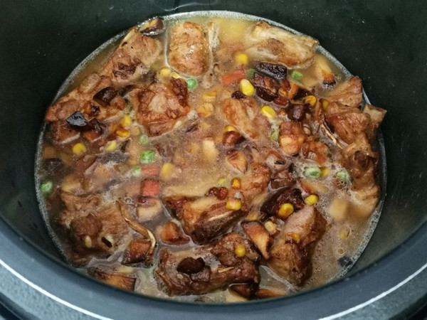 9.把炒好的排骨和菜倒入,按下煮饭键。