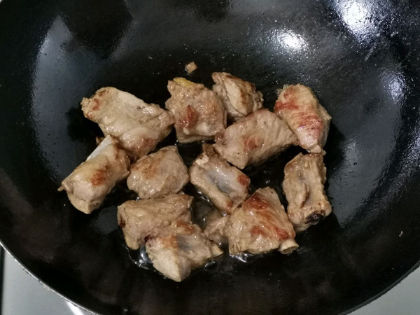5.腌制好的排骨拣出葱姜,入锅小火煎至焦黄盛出。