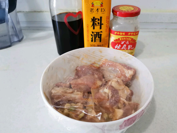 2.排骨加葱一段,姜三片,生抽一勺,料酒一勺,辣腐乳一块捣碎,手抓匀。