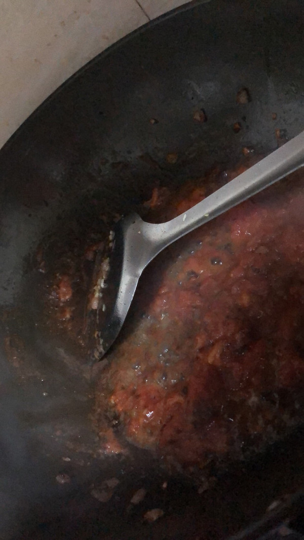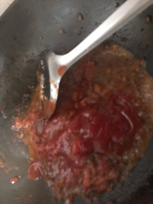 放刚才失误煮过头儿的西红柿酱和番茄酱 再次炒至焦糊