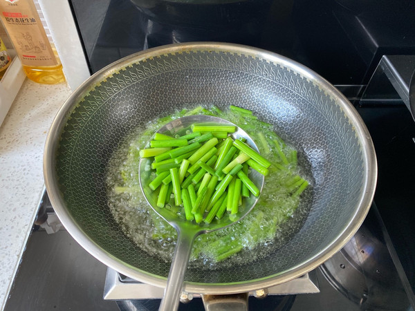 放入蒜薹段,快速炸30秒捞出,沥干油备用。