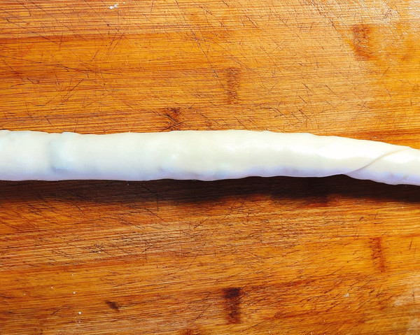 在从一头往里往里卷,同样边卷边拉伸面,最后收口放下面 卷好的饼坯盖上保鲜膜醒15分钟