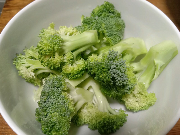 西兰花切成小朵,盐水浸泡备用
