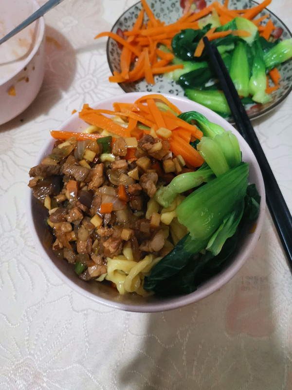肉切成丁,儿子比较胖,就以瘦肉为主啦!洋葱,胡萝卜,茭白切丁,还有一半胡萝卜切丝,青菜拿盐水浸泡半个小时