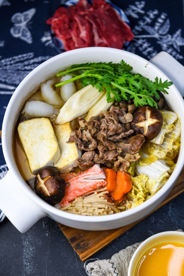 将娃娃菜,洋葱洗净切大块,香菇切花刀,胡萝卜切后块用模具按压成花朵状,豆腐切厚片,大葱斜切后片,茼蒿,牛肉片洗净备用