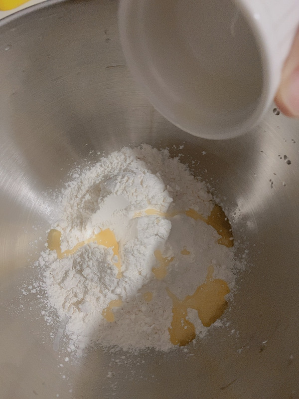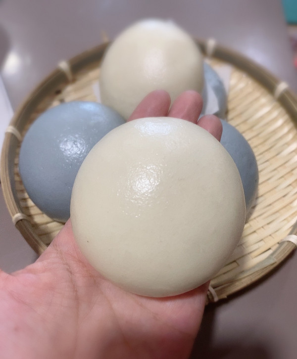 油加到面粉里面,面粉可以用低筋面粉,也可以用中筋面粉,中筋面粉吸水量稍微大一些,水量适当增加一点,我蓝色馒头用的是低筋面粉,白馒头用的中筋面粉,从外表上来说几乎没有区别