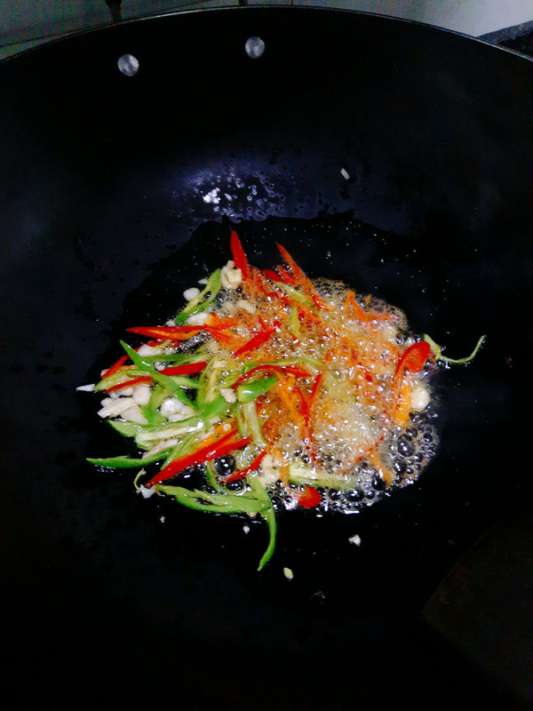 小火,炒香辣椒和蒜头