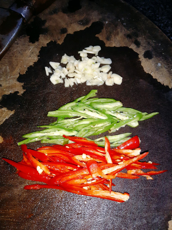 准备蒜头切碎,两种辣椒切丝