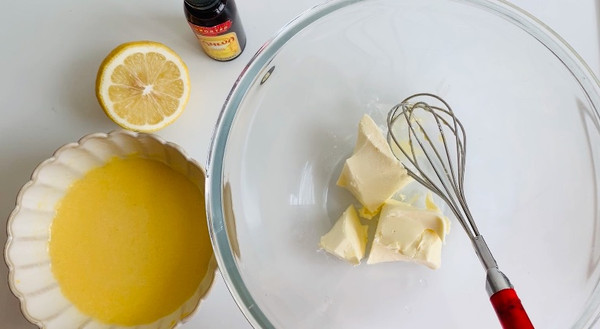 准备奶油奶酪和柠檬汁,淡奶油,糖和百利甜酒。