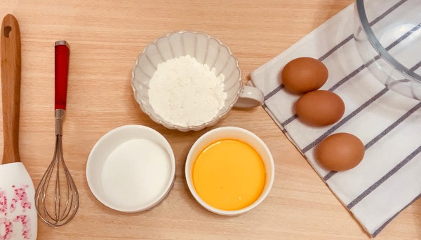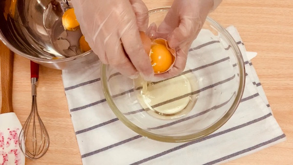 分离蛋白与蛋黄,分别放入两个干净的盆里,盆要无油无水才不会影响蛋白打发。