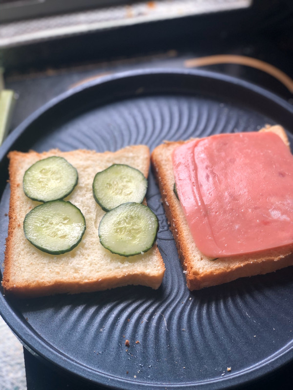 因为吐司是自己做的 所以我切了一片比较薄的放最上层… 第二层和第一层中间夹了几片青瓜片… 吃起来味道很清新而且低脂~ 鸡蛋放了胡椒粉也是蛮好吃的~ 或者洒点芝麻也是不错的