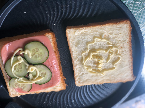 两片吐司 一边放青瓜和火腿片一边挤上蛋黄酱 然后鸡蛋放进去