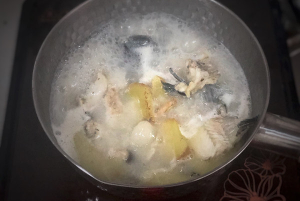 开始做鱼汤~爆姜,放入鱼头和尾自己剔除的骨头
