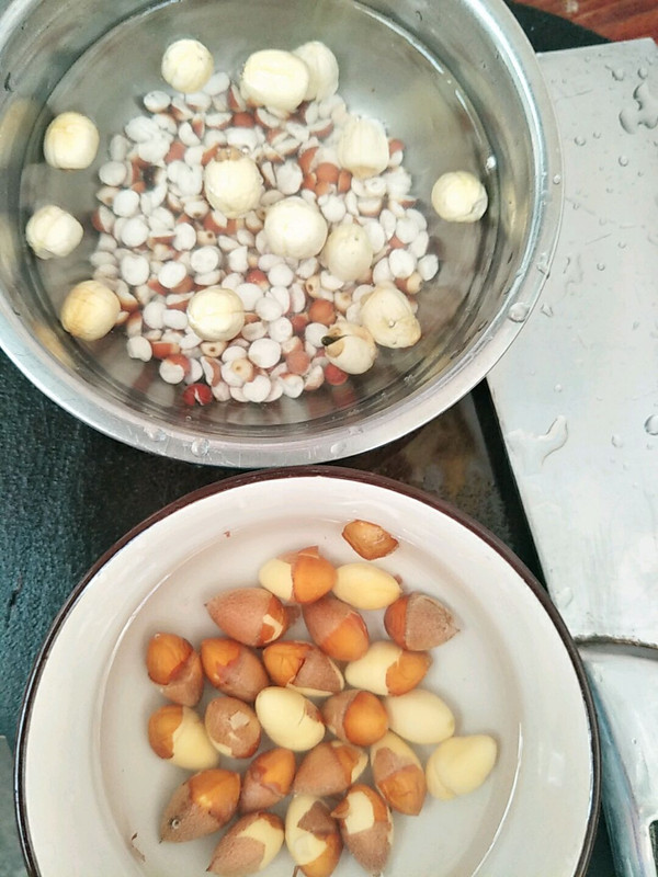 银杏去壳去外衣和莲子,茨实洗干净用清水泡1小时。