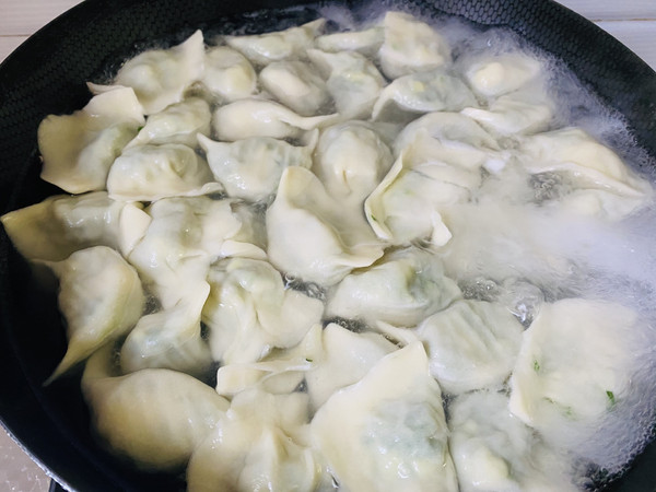 水沸腾后,白白胖胖的饺子下锅啦,素馅的饺子很容易熟,水开后一分钟就可以出锅了。