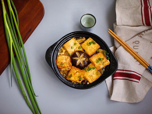 将香菇片和料汁倒入砂锅内,将香菇片放入豆腐下面。小火煲8分钟左右入味。出锅撒葱花。