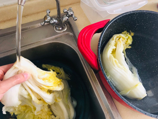 大白菜外面冲洗干净,切成四份,最好是切开口用手掰开,这样叶子比较完整