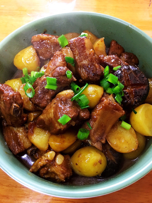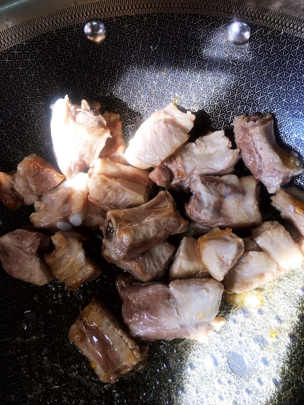 排骨上色后,加葱姜蒜,炒香,加料酒翻炒,加生抽,老抽,加香菇