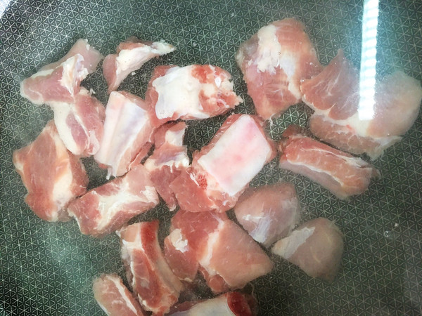 冷水下锅,焯水,捞出后,温水洗净,沥干水分备用