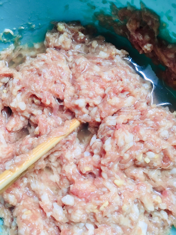 凉的清水分3次加入,顺着一个方向搅拌均匀,每次要等水分充足被肉吸收再加下一次水搅拌均匀。直到肉馅粘稠上劲即可。