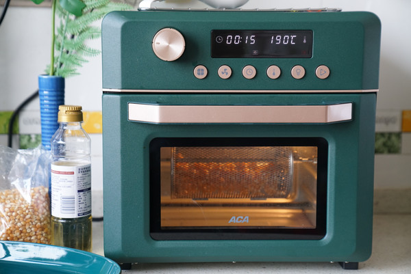 将裹好油的玉米粒入空气炸烤箱所配的转笼里,有这个转笼,咱们要炸烤翻炒干果或是做爆米花真是太赞啦。