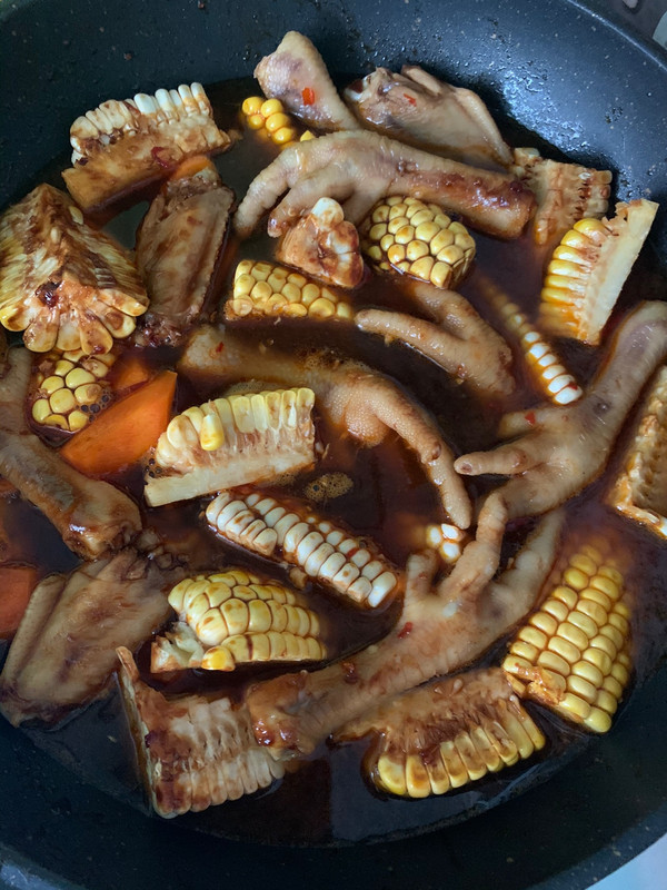 所有食材汤汁倒入砂锅 鸡爪放在下面 焖煮20分钟后把胡萝卜 鸡翅挑出来 继续煮鸡爪 煮到自己喜欢的程度 再把鸡翅胡萝卜回锅就可以上桌了