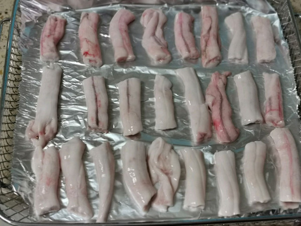将牛骨髓洗净切成小段儿,摆在铺了锡纸的炸网上。