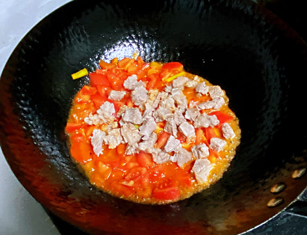 西红柿丁翻炒均匀后,倒入清洗干净的牛肉块;