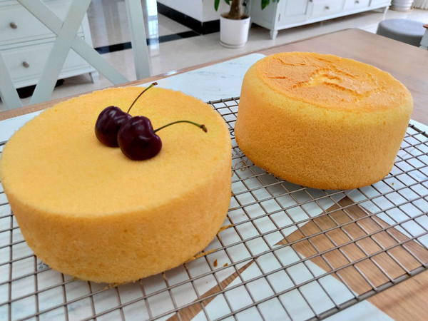 时间到后,戴手套,先拿出模具,在台面上震一下里面的热气,然后迅速倒扣在晾网上面。我一次烤了两个,一个是加高模具,一个是普通模具,都是六寸的。等它们彻底晾凉后,我们再脱模。