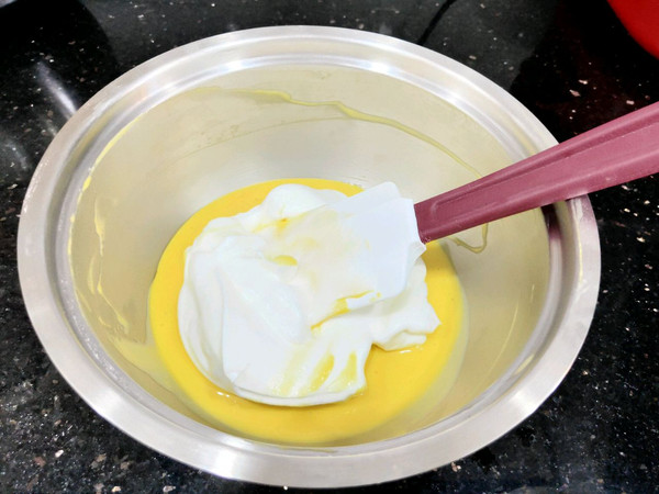 将翻拌好的糊倒入剩余的蛋白霜中,继续翻拌。(这个时候你可以去预热烤箱了,上下火150度10分钟)