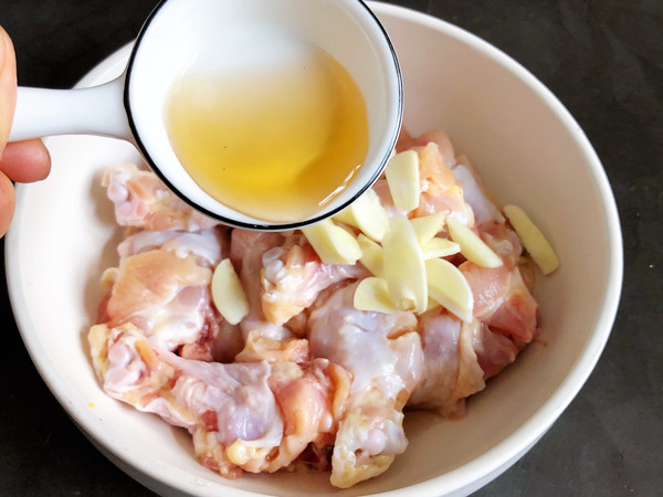 鸡翅根洗干净划两刀,加蒜片,加1勺料酒,+2勺生抽。