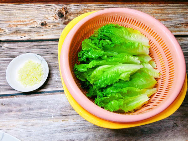 将生菜浸泡后再水下冲洗一遍,放沥水篮将水沥干,蒜瓣去皮,拍扁剁成细碎的蒜末(用碎蒜器亦可)。