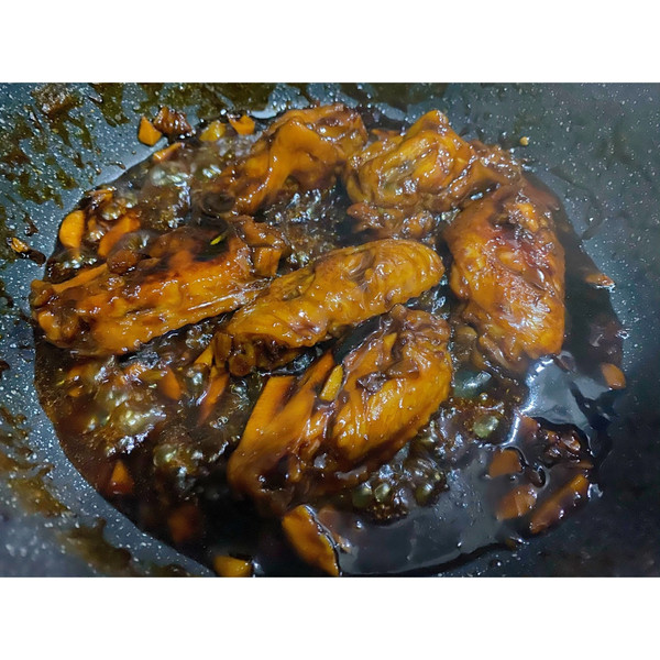 倒入可乐,可乐的量末过鸡翅表面即可,加入冰糖熬至收汁