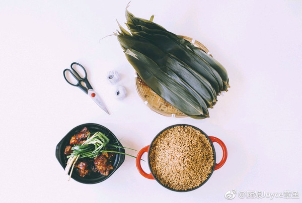 用勺子取两勺糯米(用勺子取米一来可以保证每个粽子大小匀称,二来可以保持手部干净);
