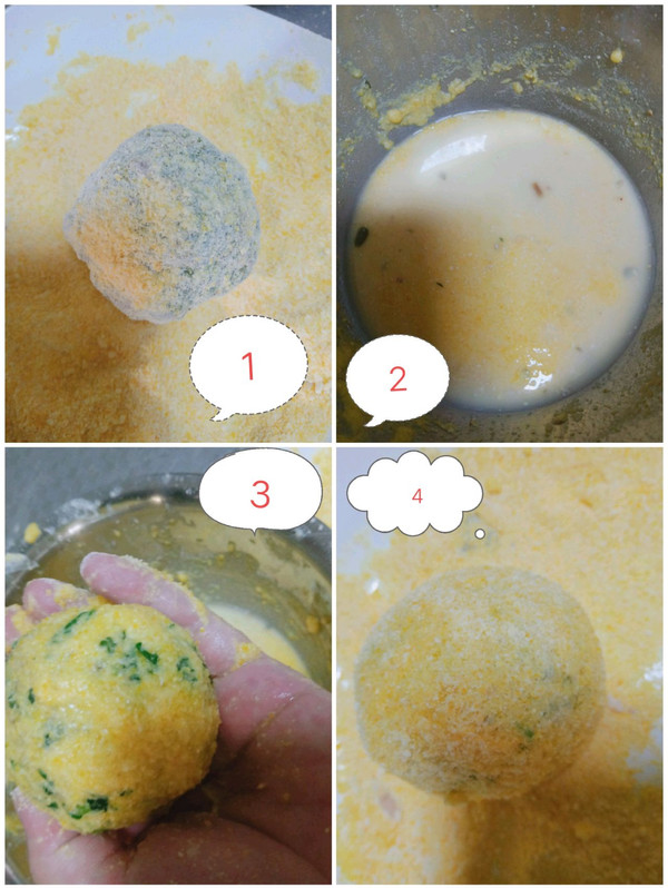 盆里放适量玉米面,加水如图2,馅团先滚一下玉米面,然后玉米糊捞出适量均匀的团在馅团上,再滚一遍玉米面即可。