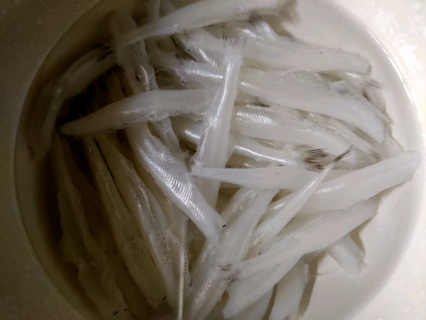 起油锅,五成油热转中火,依次放入银鱼炸至微黄沥油捞起。