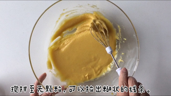 将打发的蛋白与蛋黄糊混合,搅拌时由一点方向划向七点方向进行翻拌。
