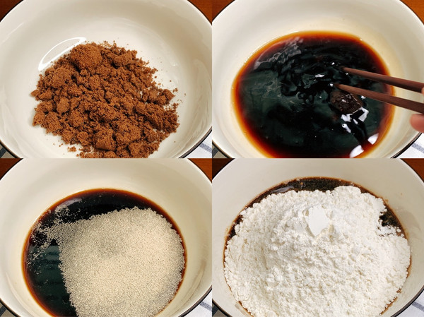 大碗里先加红糖,再加80度以上的水把红糖冲开、凉至40度以下再加酵母、搅拌均匀后加面粉
