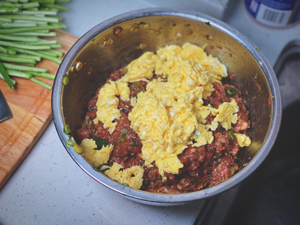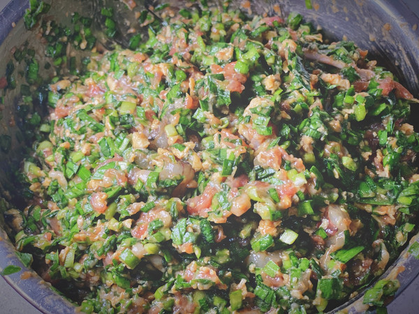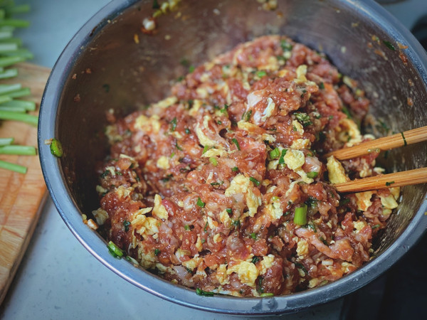 最后将洗好的韭菜切段,一点一点倒入馅料中,直至完全搅拌均匀后再顺着一个方向继续搅拌
