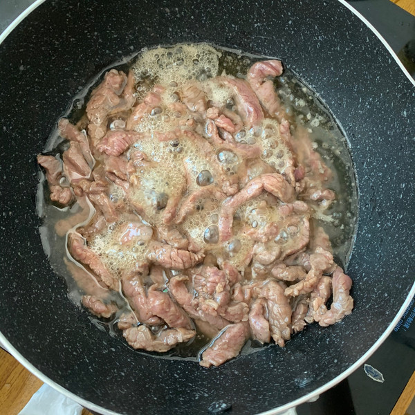 锅中倒入食用油,烧至六七成热,倒入腌制完的肉丝翻炒
