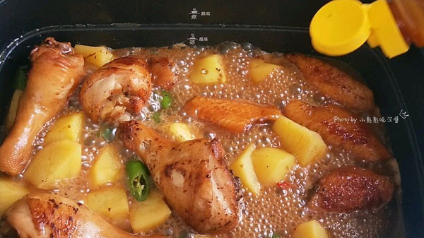 鸡腿鸡翅全都变色之后,倒入另外半瓶可乐和腌鸡腿的调料汁,下入土豆块,小米辣和小尖椒