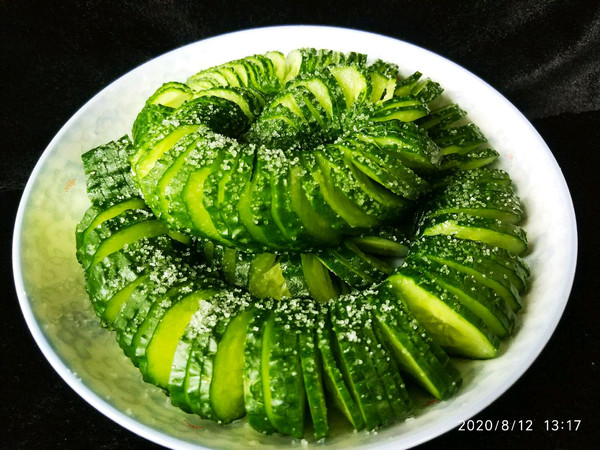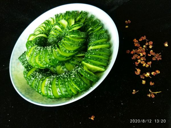抓一把盐,给他撒上,腌他一小时,中间翻腾一回,然后把水分挤干,黄瓜才会更脆
