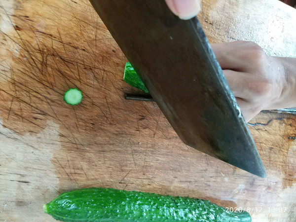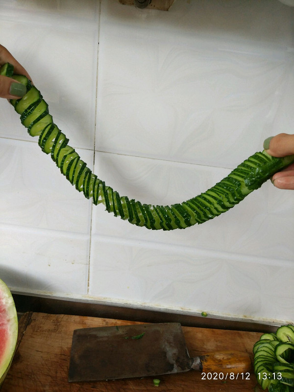 大发特擅长切这个,一分钟两条那种,可没练过的朋友不容易做到,那么咱黄瓜两侧各垫一根筷子吧,就为了不把黄瓜切断